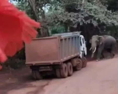 बालोद। जिले के दल्ली राजहरा-महामाया माइंस रोड पर सोमवार सुबह एक बड़ा हादसा टल गया। सड़क पर अचानक एक दंतेल हाथी आ गया। सामने से हाथी को अपनी ओर आता देख हाईवा ट्रक चालक घबरा गया। हाथी ट्रक के बेहद करीब पहुंच चुका था, लेकिन चालक ने सूझबूझ दिखाते हुए ट्रक को रिवर्स कर अपनी जान बचाई।